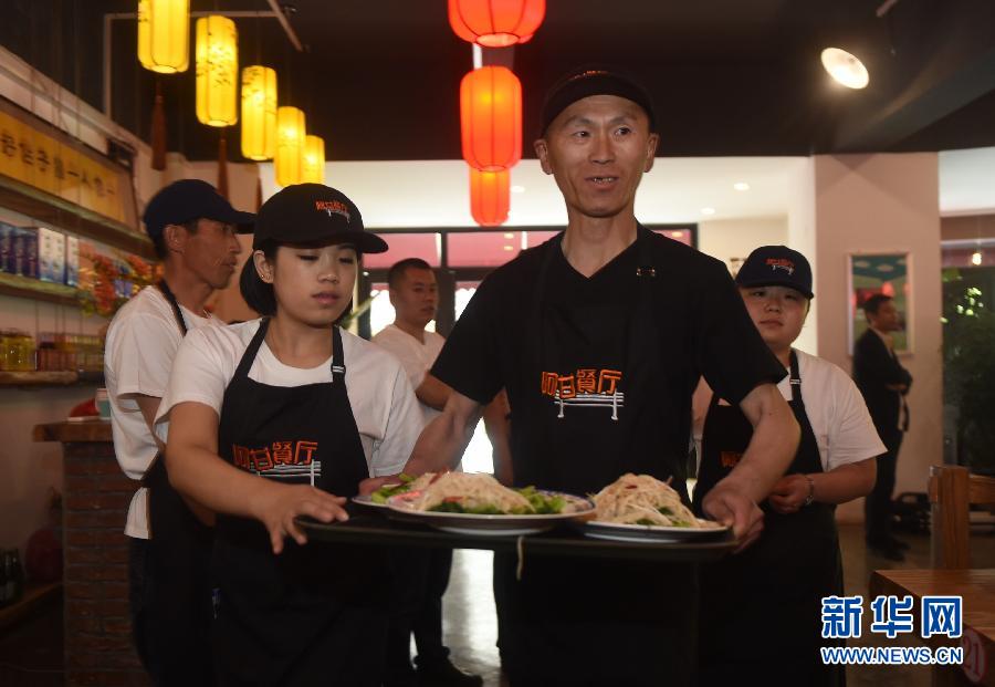 A waiter with intellectual disability serves the guests under help May 19, 2015. (Xinhua/Lin Hong)