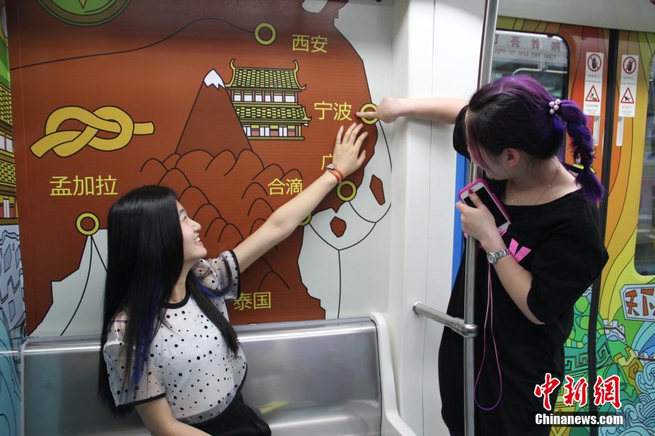 A subway train themed with Maritime Silk Road is launched in Ningbo, east China’s Zhejiang province on May 20, 2015. It is also the first train decorated with hand painting in China. (Chinanews/Lin bo)
