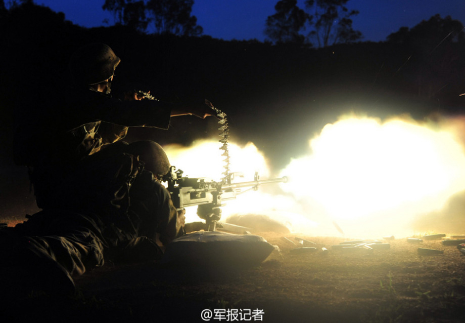 A regiment of China's 31st Group Army carries out live fire exercise with heavy machine guns to perfect their combat skills at night.(Photo/81.cn)