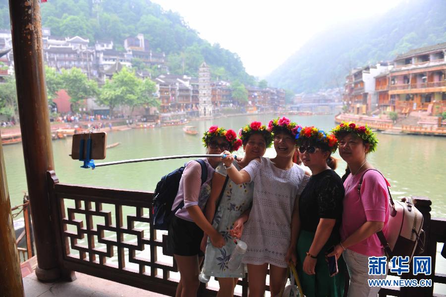 Tourists take a group selfie in Fenghuang Ancient Town, central China's Hunan Province, May 19, 2015. Tuesday is China's fifth National Tourism Day. Many scenic spots have taken certain measures and offered discounts to attract more tourists. (Xinhua/Cao Ning)