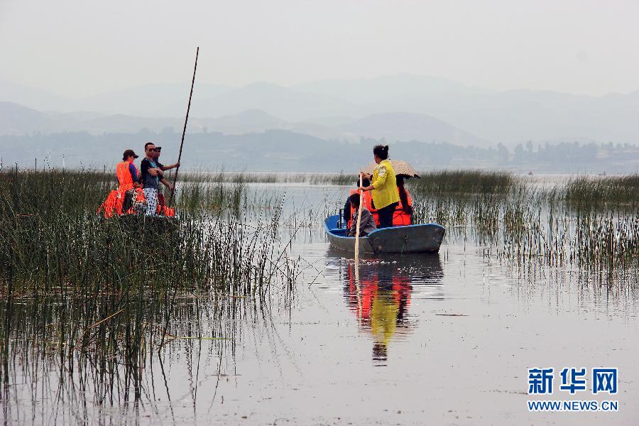 Tourists enjoy a boat trip on a lake in Bijie, southwest China's Guizhou province, May 19, 2015. Tuesday is China's fifth National Tourism Day. Many scenic spots have taken certain measures and offered discounts to attract more tourists. (Xinhua/He Huan)