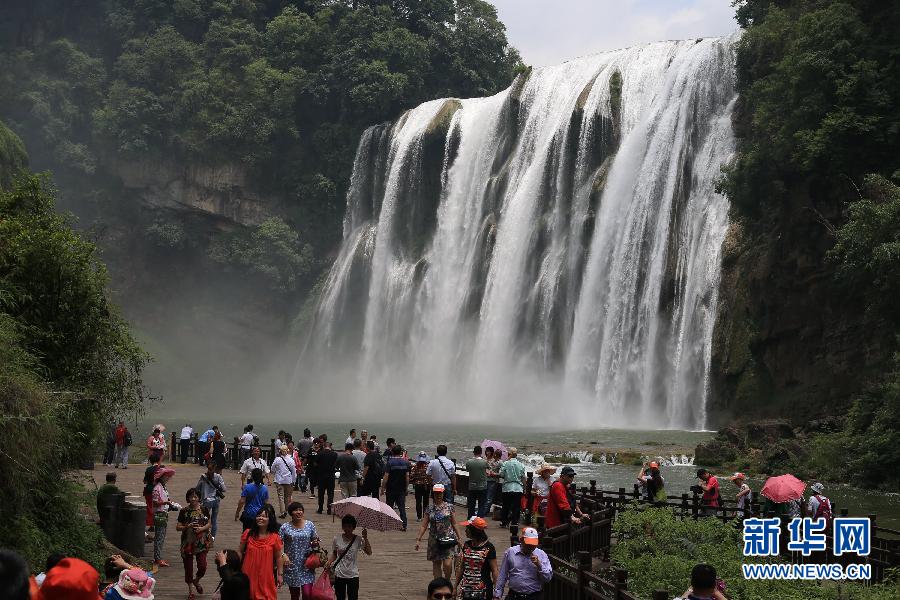 Tourists enjoy the view of the Huangguoshu Waterfall in Anshun, southwest China's Guizhou province, May 19, 2015. Tuesday is China's fifth National Tourism Day. Many scenic spots have taken certain measures and offered discounts to attract more tourists. (Xinhua/Lu Wei)