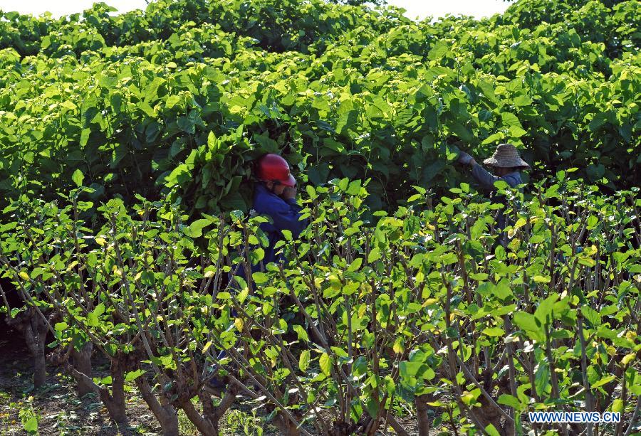 Farmers pick mulberry leaves to feed silkworms at Zhujiadou Village in Huzhou, east China's Zhejiang Province, May 23, 2015. Huzhou is a major cocoon-producing area of China which is expected to harvest about 5,400 tons of spring cocoons this year. (Xinhua/Tan Jin)