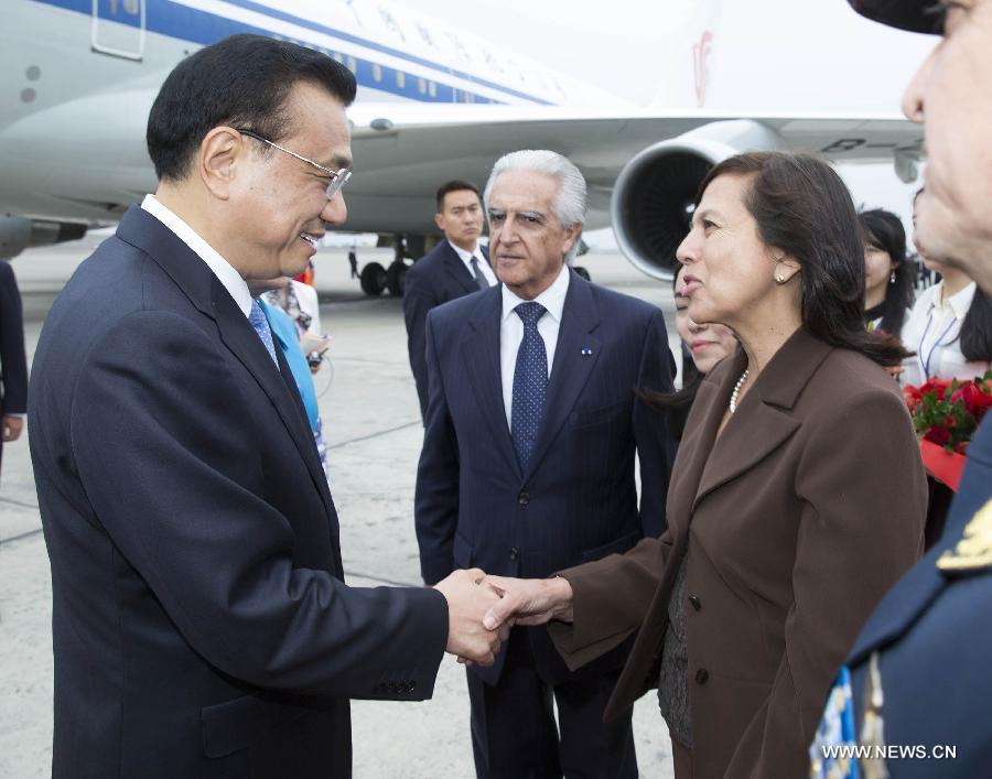 | Chinese Premier Li Keqiang (L) arrives in Lima, Peru, on May 22, 2015, for an official visit to Peru at the invitation of Peruvian President Ollanta Humala. Premier Li's wife Cheng Hong arrived with him in the same special flight. (Xinhua/Huang Jingwen) |