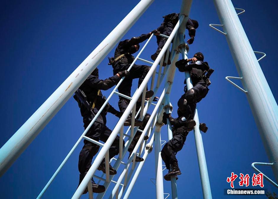 Special police force conducted multi-subject training in Urumqi, northwest China’s Xinjiang Uygur Autonomous Region on May 21, 2015. The training subjects included 110-meter steeplechase, abseiling, physical training, shooting, etc. Established in 2010, the special police force of Xinjiang has played an important role in combating terrorism and maintaining social stability. (Chinanews/Liu Xin)