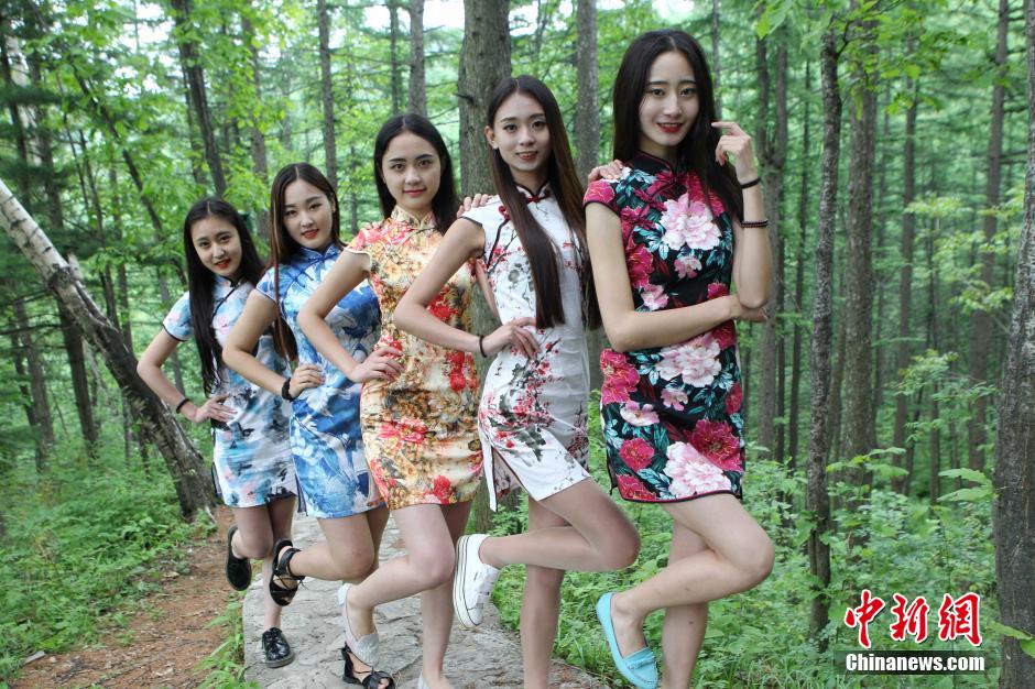 Five college girls in cheongsam pose for a "floating photo" in Luoyang Longyuwan National Forest Park, central China's Henan province, May 21, 2015. The girls wanted to promote harmony between human beings and nature. They believed that nature is the most beautiful stage. (CNS/Wang Zhongju)
