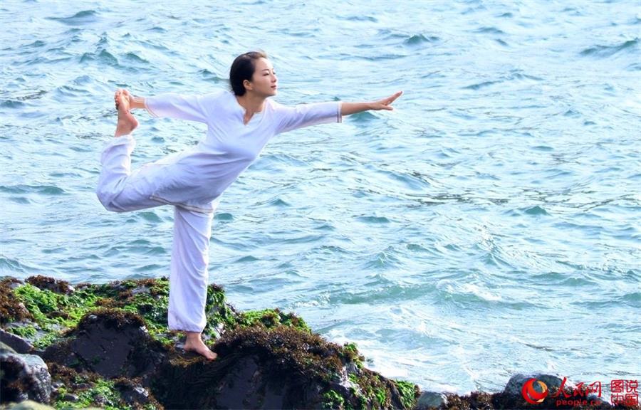 The photo shows a woman practicing yoga on the Yushan Island, near Ningbo, east China's Zhejiang province. Yushan Isand has abundant fish, shellfish and algae resources.(Photo/people.cn)