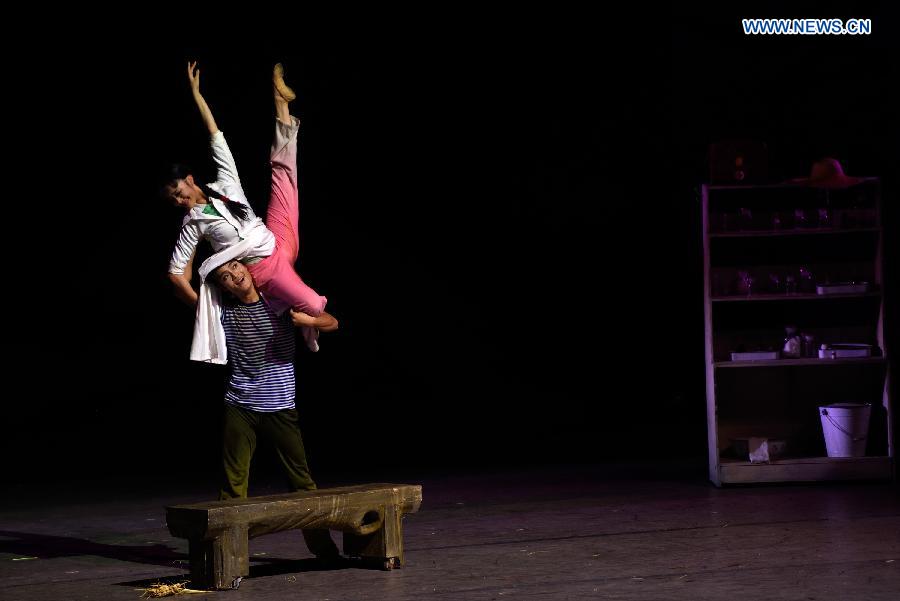 Dancers from the Song and Dance Troupe of the Xinjiang Production and Construction Corps perform in a dance drama in Beijing, capital of China, May 27, 2015. Invited by the organizer of the 15th "Meet in Beijing" Arts Festival, the dance drama premiered here on Wednesday. (Xinhua/Jin Liangkuai)