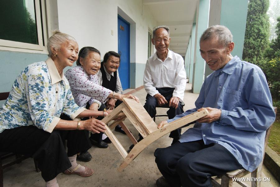 Fei Lunbao makes a chair in his studio in Huqiao Village, Jiujiang County of east China's Jiangxi Province, May 27, 2015. Fei, now 65 years old, became blind when he was 5 years old as a result of disease and started to do carpentry work in his 20s. (Xinhua/Yang Fengsheng)