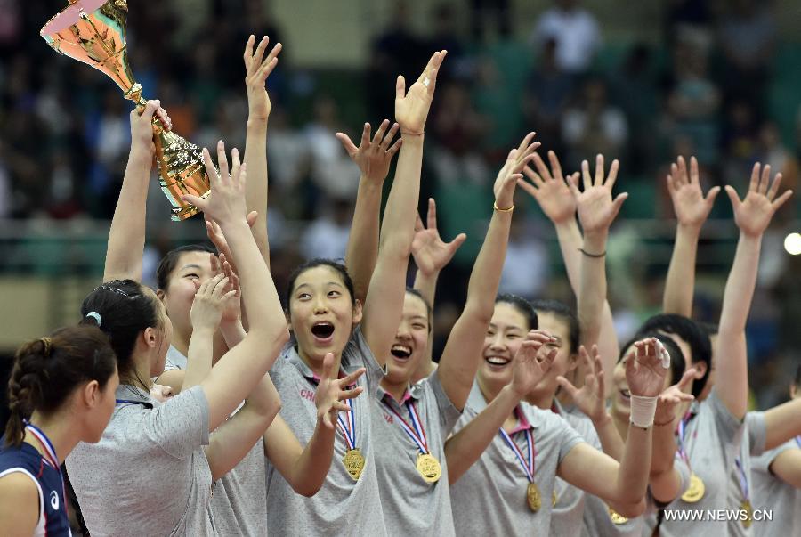 Team China celebrate with the trophy during the award ceremony after the final match against South Korea at the 18th Asian Senior Women's Volleyball Championships in Tianjin, north China, May 28, 2015. China won 3-0 to claim the title. (Xinhua/Yue Yuewei)