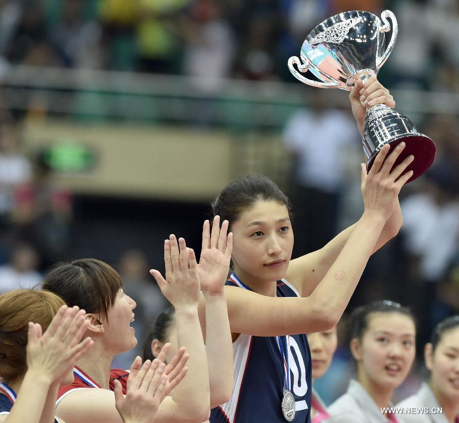 Kim Yeon Koung of South Korea holds up the trophy for runner up during the award ceremony after the final match against China at the 18th Asian Senior Women's Volleyball Championships in Tianjin, north China, May 28, 2015. South Korea lost 0-3. (Xinhua/Yue Yuewei)