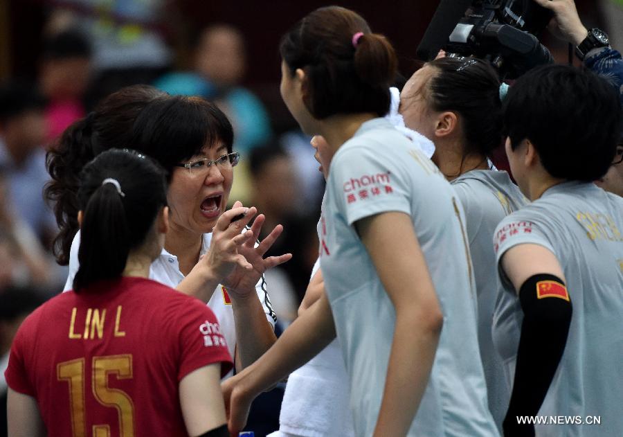 Head coach Lang Ping (2nd L) of China gives instructions during the final match against South Korea at the 18th Asian Senior Women's Volleyball Championships in Tianjin, north China, May 28, 2015. China won 3-0 to claim the title. (Xinhua/Zhang Chenlin)