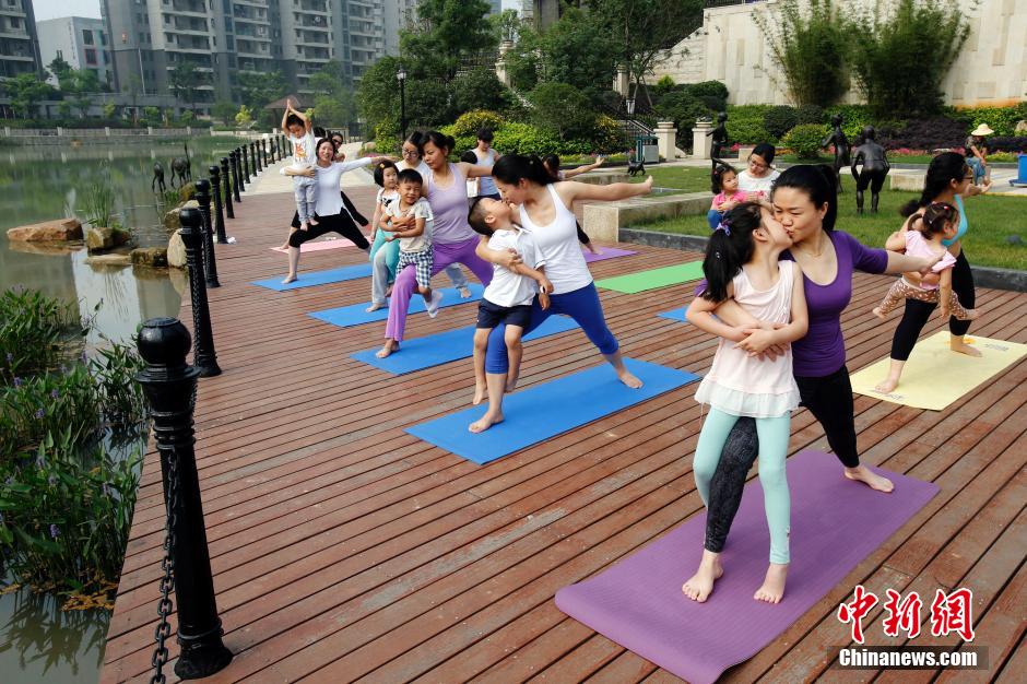 A couple of mothers do yoga with their children in Wuhan, Hubei, May 31, 2015. (Chinanews/Zhong Xin)