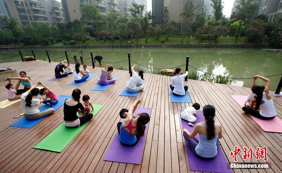 A couple of mothers do yoga with their children in Wuhan, Hubei, May 31, 2015. (Chinanews/Zhong Xin)