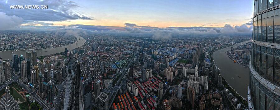 Photo taken from Shanghai Tower on Sept. 20, 2014 shows a view of downtown Shanghai, east China. Shanghai Tower, a megamall skyscraper under construction, stands approximately 632 meters high and has 128 stories, with a total floor area of 380,000 square meters. It's projected to open to the public in mid-2015. (Xinhua/Huang Weiguo)