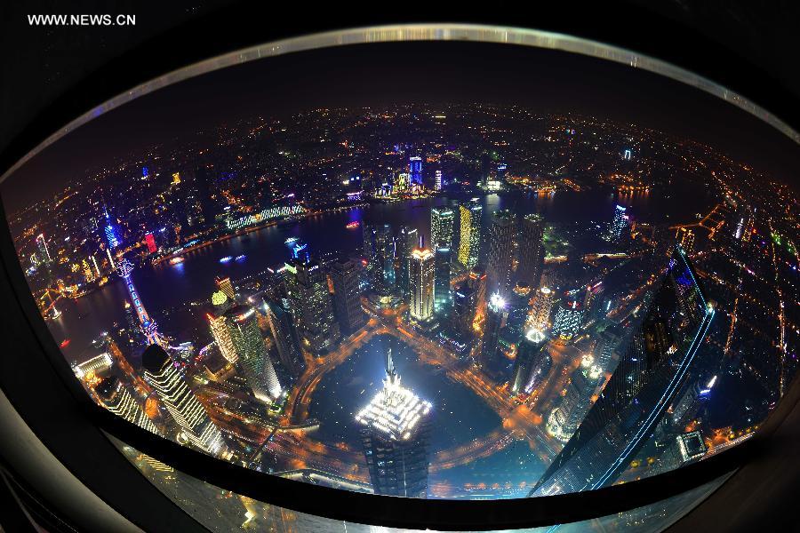 Photo taken from Shanghai Tower on April 27, 2015 shows a view of downtown Shanghai, east China. Shanghai Tower, a megamall skyscraper under construction, stands approximately 632 meters high and has 128 stories, with a total floor area of 380,000 square meters. It's projected to open to the public in mid-2015. (Xinhua/Huang Weiguo)