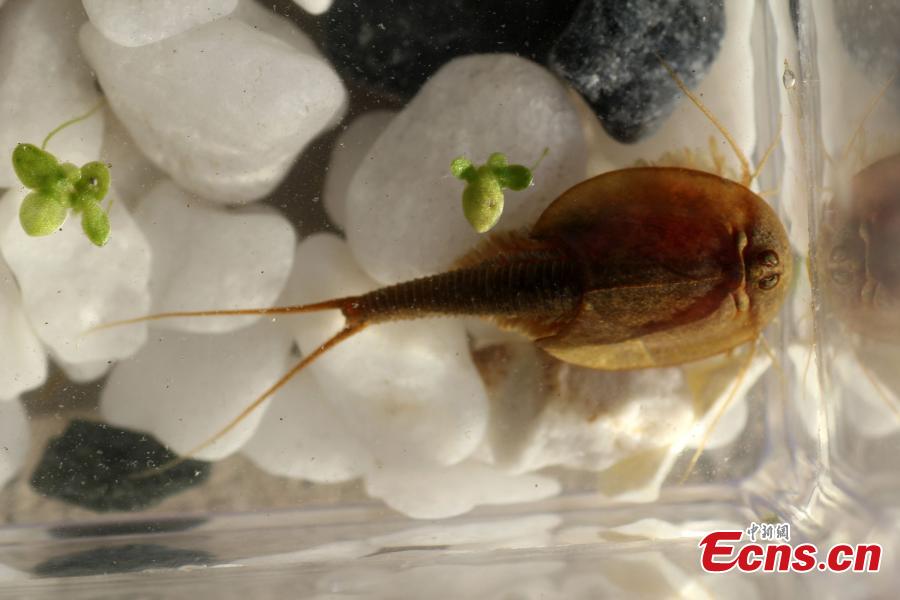 A tadpole shrimp swims in a vessel at the Insect Museum of West China in Chengdu city, capital of Southwest China's Sichuan province. Tadpole shrimps and fairy shrimps, which both have outlived dinosaurs, were found in a field by researchers of the museum.
