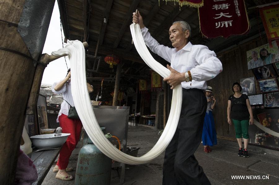 Chen Jinshui, inheritor of the technique of pulling sticky sugar, wields long waves of sticky sugar in Anchang Township of Shaoxing City, east China's Zhejiang Province, June 2, 2015. Chen Jinshui, who is more than 80 years old and learned the sugar-pulling technique from 13 years old, is always a highlight as he showcases his sugar-pulling technique, an intangible culture heritage, in Anchang. Sugar extracted from sprouts of wheat will be heated in a wok until it turns to syrup. Chen scoops up the syrup and thresh the goo vigorously back and force until the sugar color turns from dark brown to white. The sugar will eventually be cut up and served as a unique local snack. (Xinhua/Zhang Hui)
