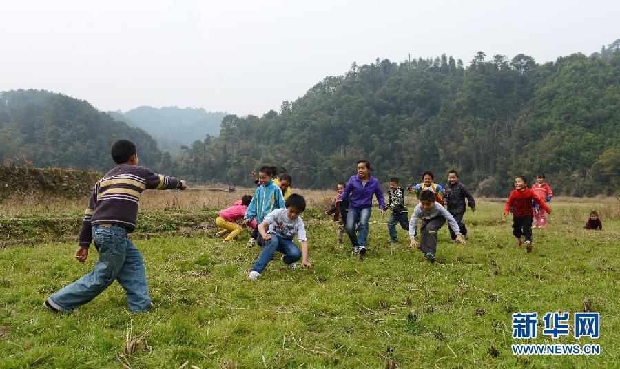 | Children play "wooden people" game in a field in Zhaoping county, southwest China's Guangxi Zhuang Autonomous Region, Jan. 26, 2014. (Xinhua/Liu Fei) |