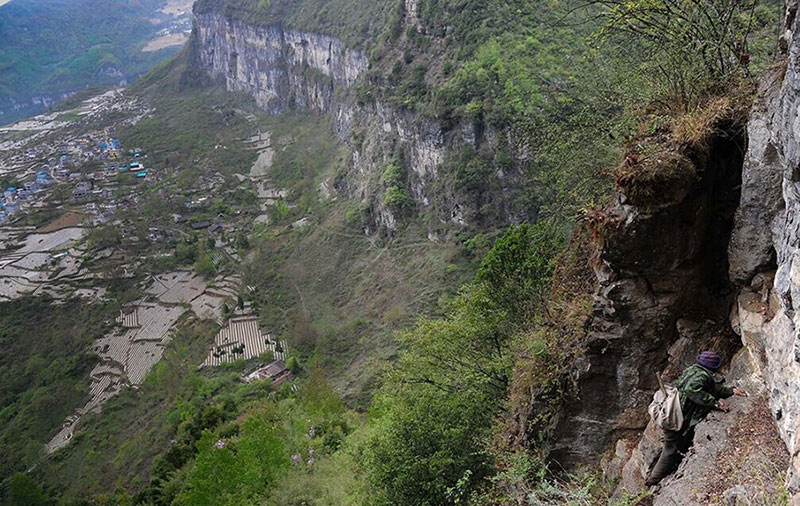 A villager climbs on the cliff. (Western China Metropolis Daily/Yang Tao)