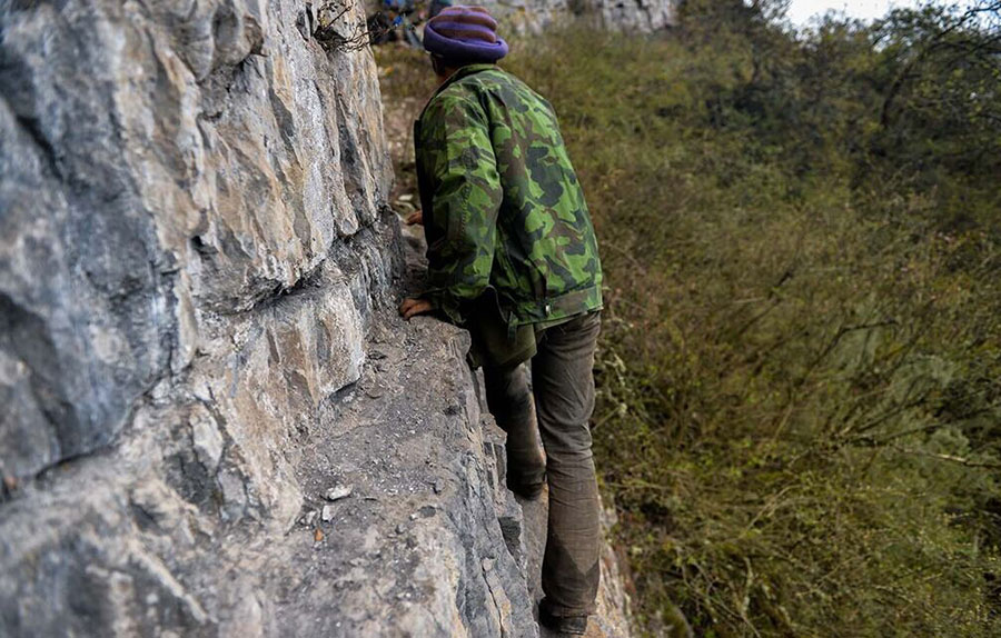 A villager climbs on the cliff. (Western China Metropolis Daily/Yang Tao)
