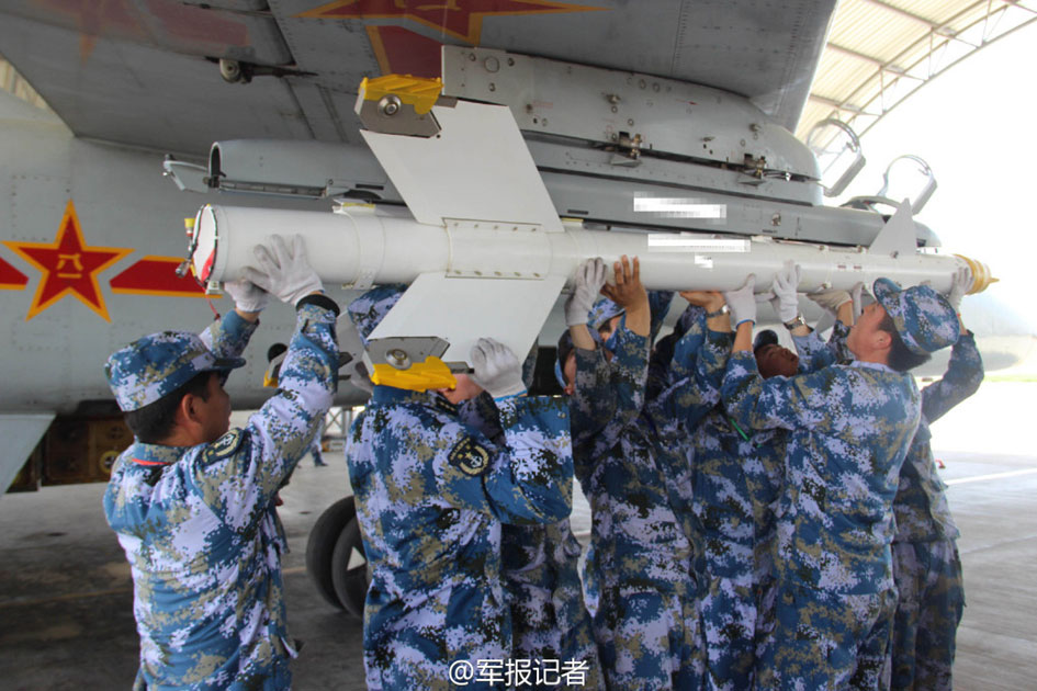 In mid May, more than 20 naval air force pilots from the PLA Navy North Sea Fleet launch missile attacks in the real combat-liking trainings in the Bohai Sea. These trainings aim at enhancing the pilots' battle awareness and emergency response awareness.(Photo/81.cn)