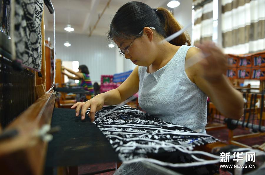 | A worker weaves Xilankapu, a Tujia brocade, at a brocade company in Enshi Tu and Miao Autonomous Prefecture, central China's Hubei Province, June 2, 2015. (Photo/ Xinhua) |