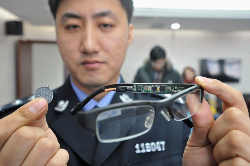 Cheating equipment confesticated - glasses with hidden camera and coins with receivers. (Photo/Haiwainet.cn)