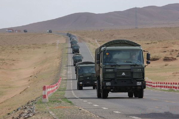 | The troops participating in the drill maneuver on their way to the Zhurihe training base in North China's Inner Mongolia Autonomous Region. (CNS Photo) |
