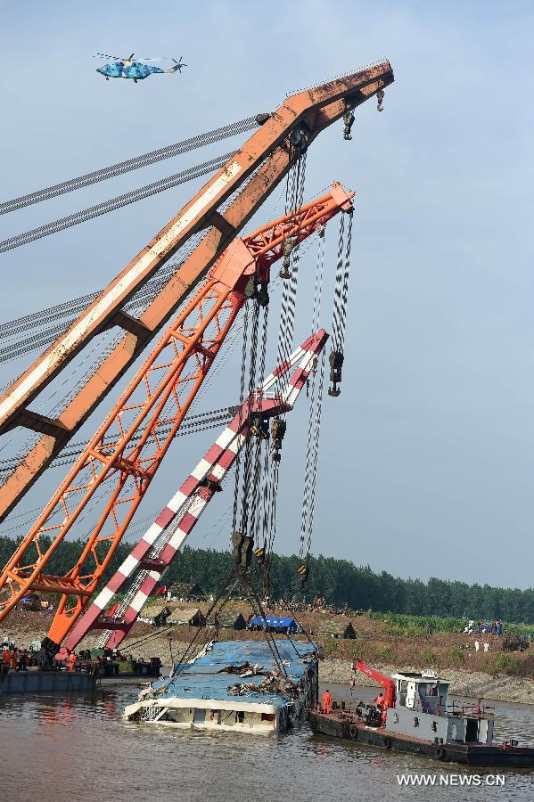 Photo taken on June 5, 2015 shows the capsized cruise ship Eastern Star being hoisted in the section of Jianli on the Yangtze River, central China's Hubei Province. The cruise ship that capsized on the Yangtze River on Monday night has been hoisted from the river after rescuers righted it on Friday morning. (Xinhua/Hao Tongqian)