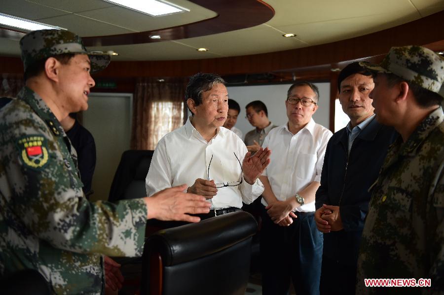 Chinese Vice Premier Ma Kai (C) inspects the rescue scene of the capsized cruise ship Eastern Star in the Jianli section of the Yangtze River in central China's Hubei Province, June 5, 2015. Ma chaired a meeting on search and rescue work of the capsized vessel in Jianli on Friday. (Xinhua/Hao Tongqian)