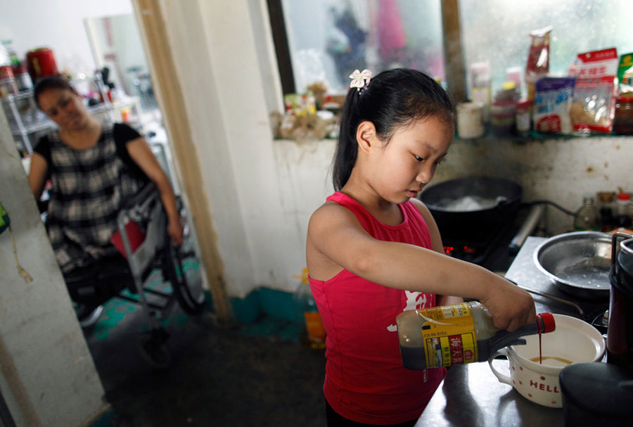 Zhao Xiaoxi cooks the meal for her mother in the kitchen. (Photo/Youth.cn)