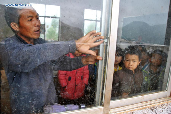 | Xie Bihua closes a window of the classroom of the primary school in the remote mountain area of Wumeng in Dougu Township, southwest China's Guizhou Province, May 28, 2015. Xie, the only teacher of the Waying branch of the Guankou Primary School in Dougu Township, has taken care of about 20 pupils in the primary school for six years, during which he not only passed on knowledge to them, but also be responsible for their daily life. Located in the remote mountain area, the school was set up for pupils' convenience, who otherwise would have had to walk for more than two hours to school. (Xinhua/Yang Wenbin) |