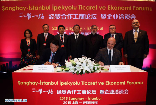 | President of Shanghai Chamber of Commerce for Import and Export Wang Xinpei (L, front) and Turkey's Foreign Economic Relations Board President Omer Cihad Vardan (R, front) sign cooperation agreement at the "Belt and Road Initiative" Trade and Economy Forum in Istanbul, Turkey, on May 8, 2015. (Xinhua/He Canling) |