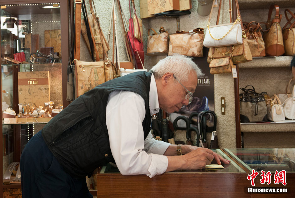 The owner of a leather shop does accounts in Via Paolo Sarpi, Milan, Italy, June 4, 2015. (CNS/Li Qing)