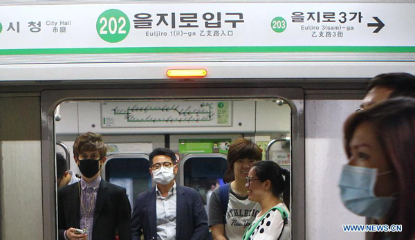| People wearing face masks take subway in Soul, capital of South Korea, June 5, 2015. Public distrust deepened in South Korea over the government's response to the deadly Middle East Respiratory Syndrome (MERS) as the government belatedly broadened countermeasures after a surge in the viral disease spread. (Xinhua/Yao Qilin) |