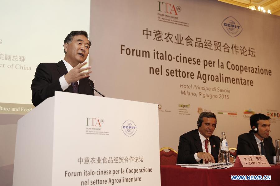 | Visiting Chinese Vice Premier Wang Yang delivers a speech during the forum on China-Italy agriculture cooperation, in Milan, Italy, on June 9, 2015. (Xinhua/Ye Pingfan) |