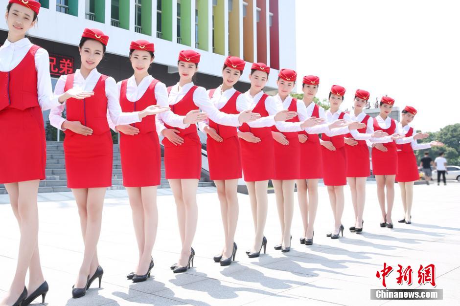 Dressing up in different costumes, the students majoring in in-flight service in Jiangnan Film and Television Art College pose for graduation photos in east China’s Jiangsu province on June 8, 2015. (Chinanews/Sun Quan)
