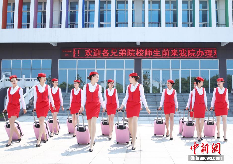 | Dressing up in different costumes, the students majoring in in-flight service in Jiangnan Film and Television Art College pose for graduation photos in east China’s Jiangsu province on June 8, 2015. (Chinanews/Sun Quan) |