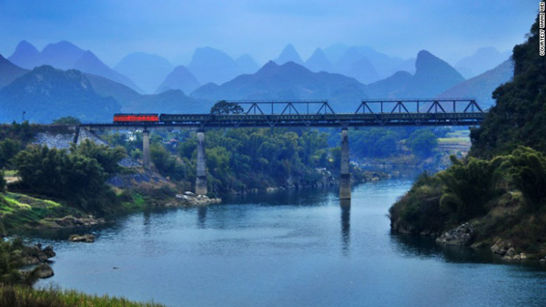 | A train moves across Longjiang Bridge, Liu Zhou, southwest China's Guangxi Zhuang Autonomous Region. (Photo/Wang Wei) |