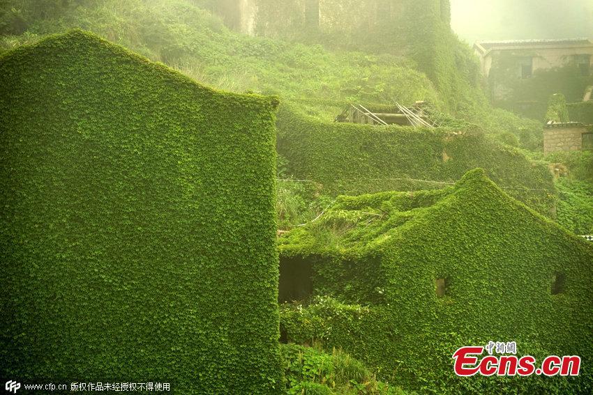 Houses covered with tendril climbing plants are seen on a deserted village in Zhoushan, East China’s Zhejiang province on May 31, 2015. The former fishing village has been reclaimed by nature after its villagers move out.