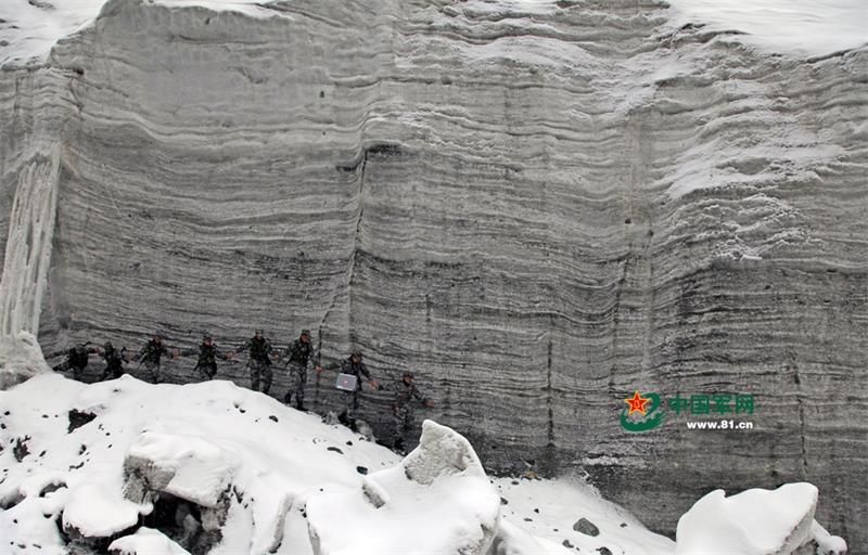 The photo shows a frontier company called Khunjerab company patrolling in the snow. Khunjerab means a bloodstained passage in Tajik language. Khungerab Pass is located at the westernmost point of the Pamirs with an average elevation of more than 4,800 meters. In each patrol, soldiers might be confronted with mud-rock flows, snow storms, hails, avalanches and animal attacks. (Photo/81.cn)