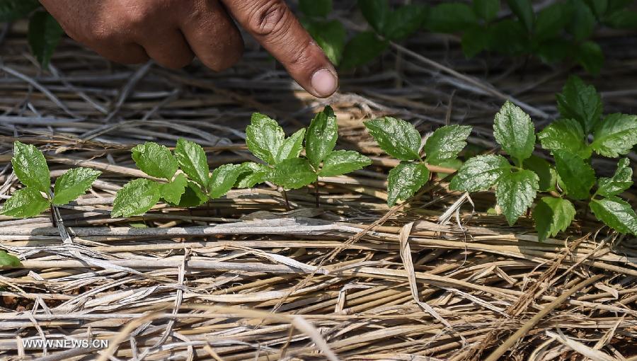 A villager takes care of ginseng seedlings at Yulin Village in Ji'an, northeast China's Jilin Province, June 11, 2015. China has a long history of cultivating ginseng, which is considered to be nutritious and to have medicinal value in traditional Chinese medicine. Considered as the world's largest ginseng production area, Jilin produces about 85 percent of China's total ginseng output and 70 percent of the world's output. More than 98 percent of ginseng in Jilin is currently cultivated, not grown in the wild. (Xinhua/Wang Haofei)