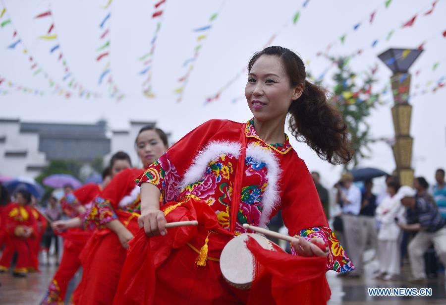 Residents play the waist drums on a street in Qianjiang City, central China's Hubei Province, June 14, 2015. Residents of Qianjiang City, which is well known for its intangible culture heritages such as Jianghan Shadow Play, Flower Drum Opera and Dragon Dance, has made these heritages as a part of their daily leisure time. (Xinhua/Song Wen)