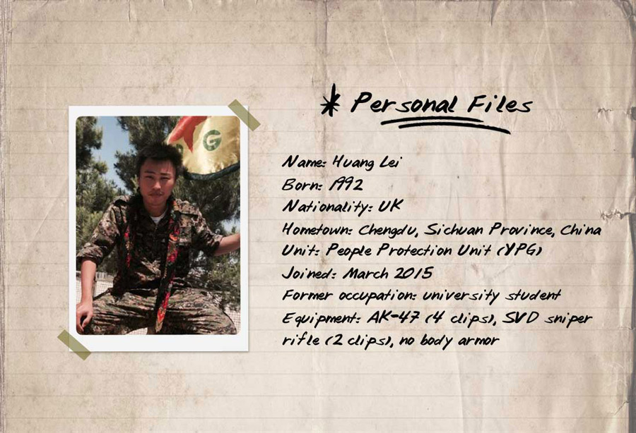 Born in Southwest China's Sichuan Province, Huang moved to Britain as a child. After studying at the University of Manchester. Huang joined the fight with the Kurds in March. "I saw a Kurdish woman strapped with explosives run towards ISIS militants to save her homeland," said Huang.