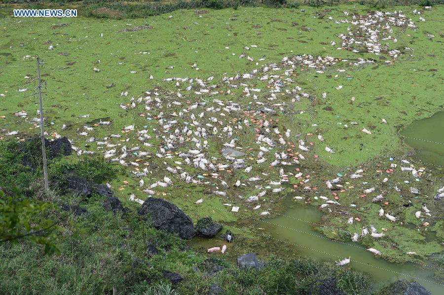 Dead pigs are seen drifting after a farm flooded by heavy rainstorms in Liuye Township in Southwest China's Guangxi Zhuang Autonomous Region on June 16, 2015. [Photo/Xinhua]