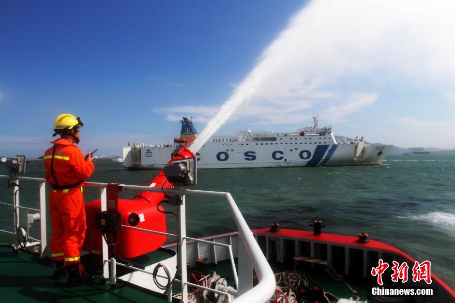 A passenger ship search and rescue exercise is conducted in Xiamen, southeast China’s Fujian province on June 15, 2015. Over 200 people, seven ships and two helicopters from maritime administration, fire control, emergency aid and other departments participated in the exercise. (CNS/Zeng Demeng)