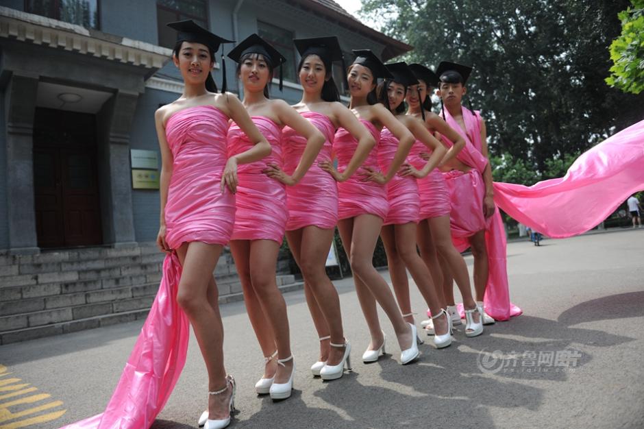 Eye-catching college graduates wearing pink ribbons take photos in Shandong University. (Photo/www. iqilu. Com)