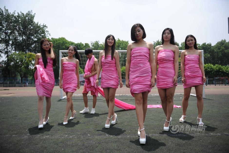Eye-catching college graduates wearing pink ribbons take photos in Shandong University. (Photo/www. iqilu. Com)