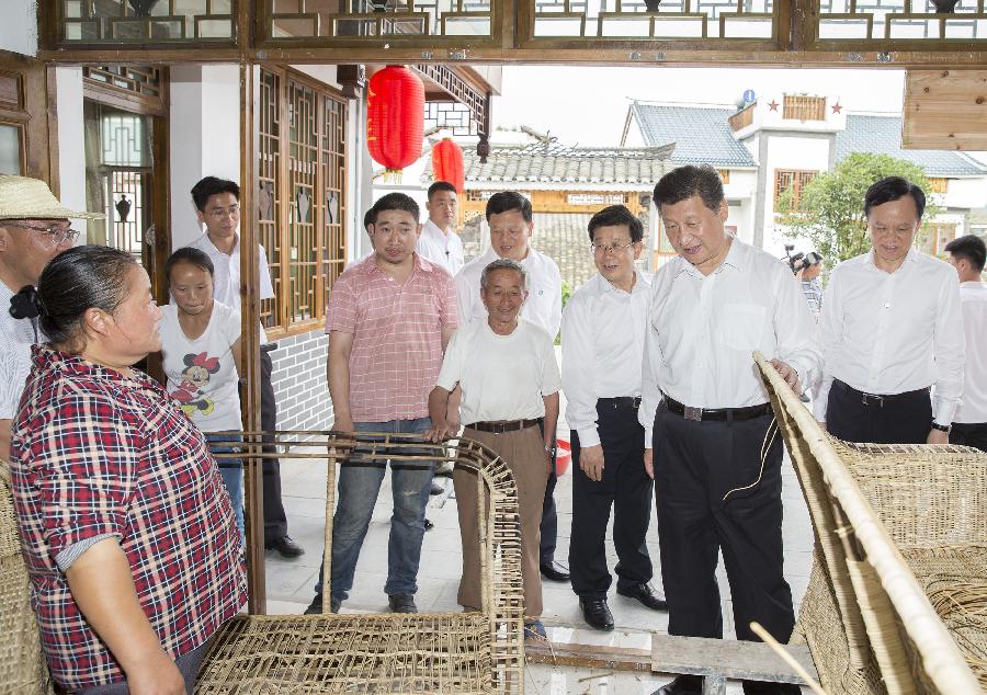 Chinese President Xi Jinping (2nd R) watches rattan plaited articles made by villagers at Huamao Village of Fengxiang Township in Zunyi County, southwest China's Guizhou Province, June 16, 2015. Xi had an inspection tour in Guizhou Province from June 16 to 18. (Xinhua/Huang Jingwen)